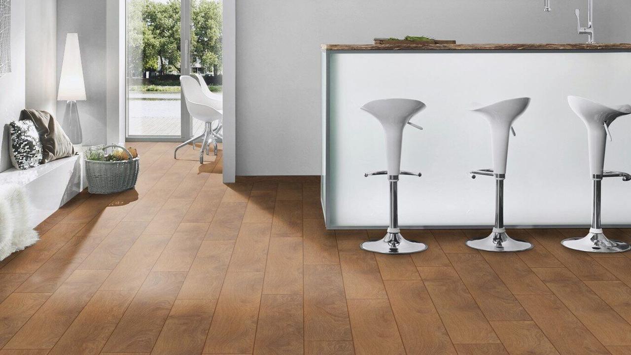 • Уникальный процесс сверхточного синхронного тиснения поверхности — когда структура поверхности совпадает с рисунком декора — придает ламинированным полам вид паркета из массива